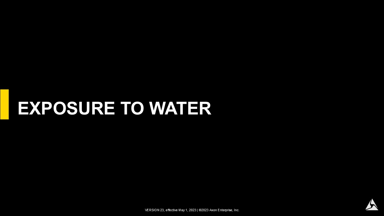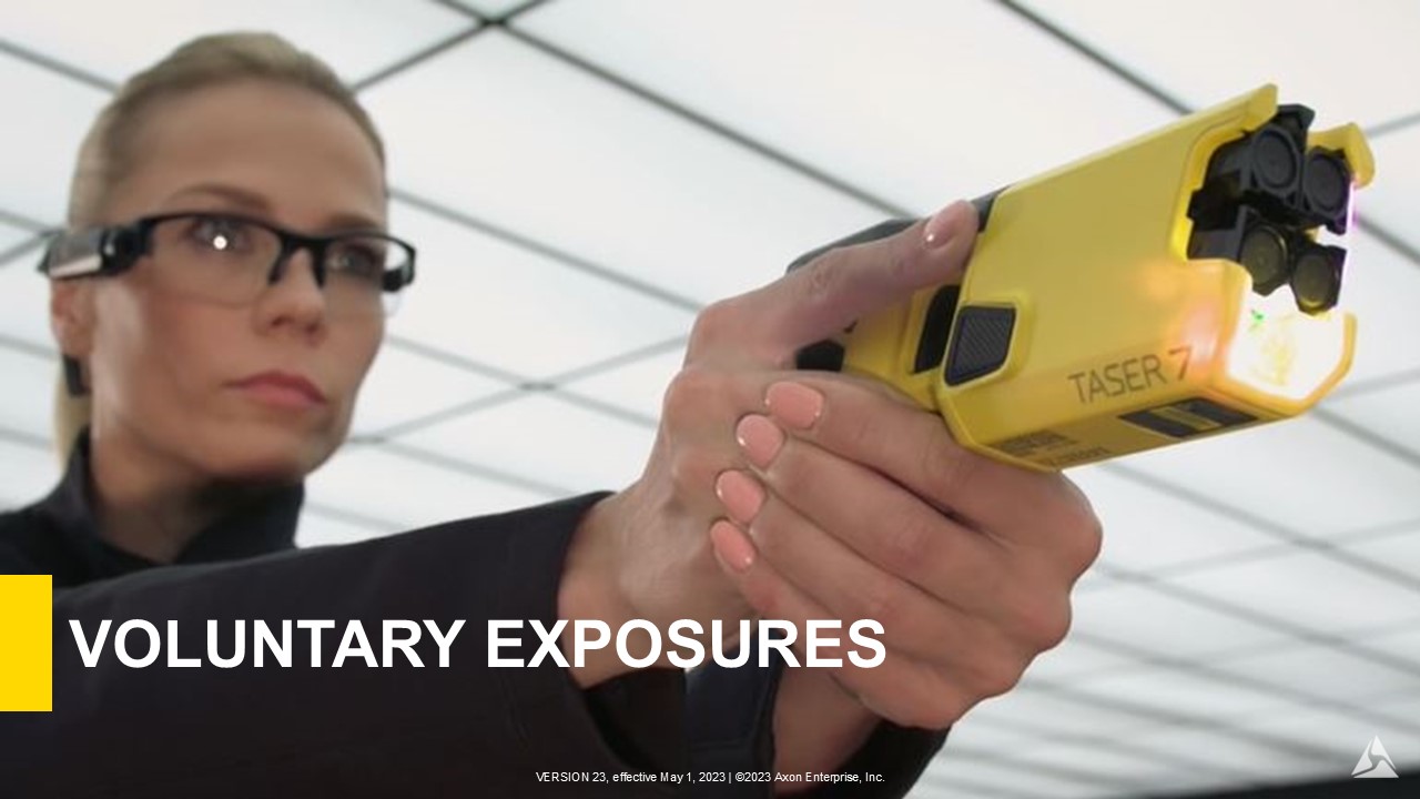 See the Voluntary Exposure Guidelines in the current TASER Training Materials before you conduct any voluntary exposures. All voluntary exposures shall be conducted in conjunction with Axon’s safety protocols and guidelines (e.g. eye protection, proper spotting, etc.)